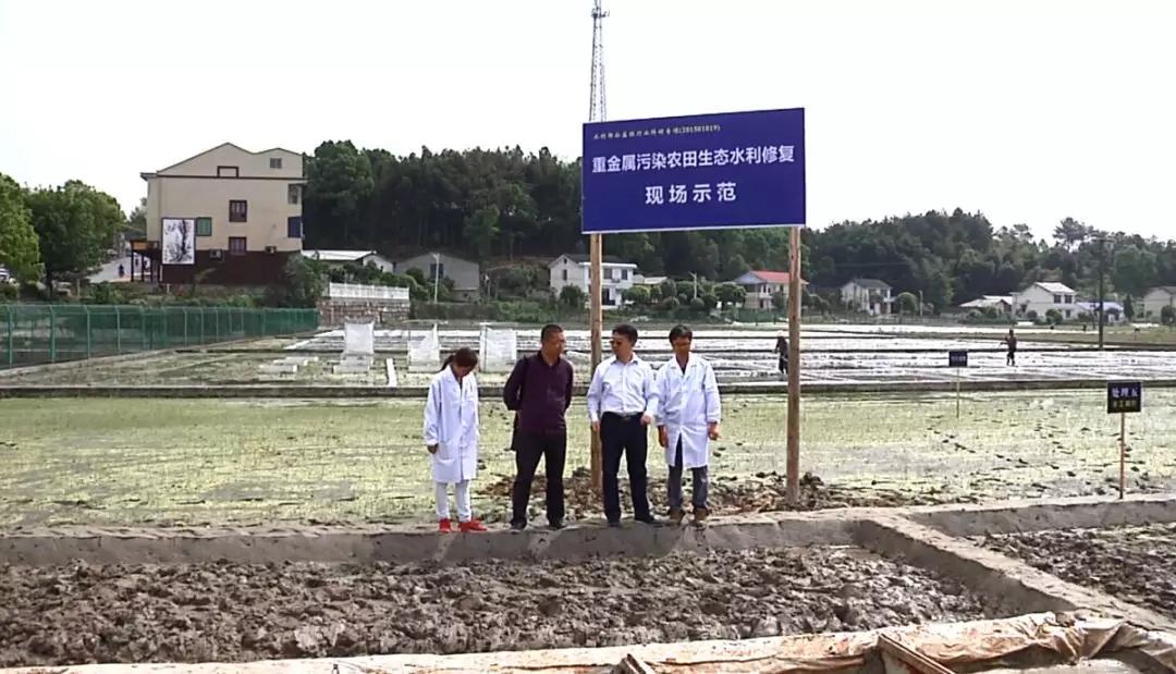 汤显强(左二)在“重金属污染农田生态水利修复”项目示范现场指导工作