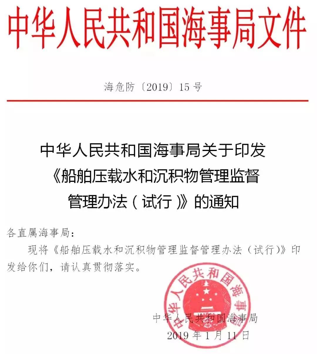 2019年1月11日,中国海事局发布《船舶压载水和沉积物管理监督管理办法(试行)》的通知。自2019年1月22日起,压载水公约在我国正式生效。