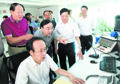 翁孟勇副部长(左三)在三峡通航指挥中心察看船舶过闸情况