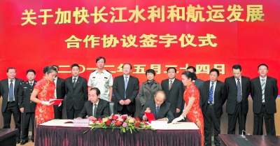 图为长江水利委员会副主任杨淳(前右)、长江航务管理局副局长阮瑞文(前左)代表双方签订合作协议
