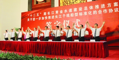 6月13日,在长江水运发展协调领导小组第三次会议上,交通运输部与沿江七省二市人民政府共同签署了《“十二五”期长江黄金水道建设总体推进方案》(以下简称《方案》)。《方案》以建设畅通、高效、平安、绿色的长江现代化水运体系为目标,确定到2015年,长江干线航道、主要支流航道、港口、船型标准化、支持保障系统等方面取得重大进展,长江水运服务能力全面提升。