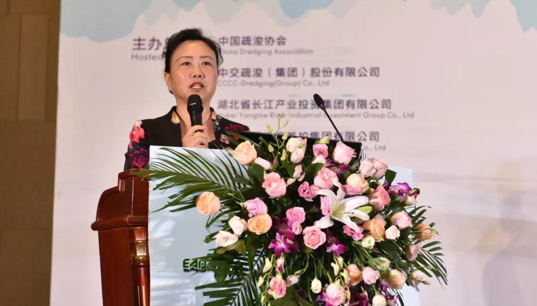 中交基础设施养护集团有限公司总经理崔玉萍作题为《水环境生态建设和淤泥资源化利用》的报告;