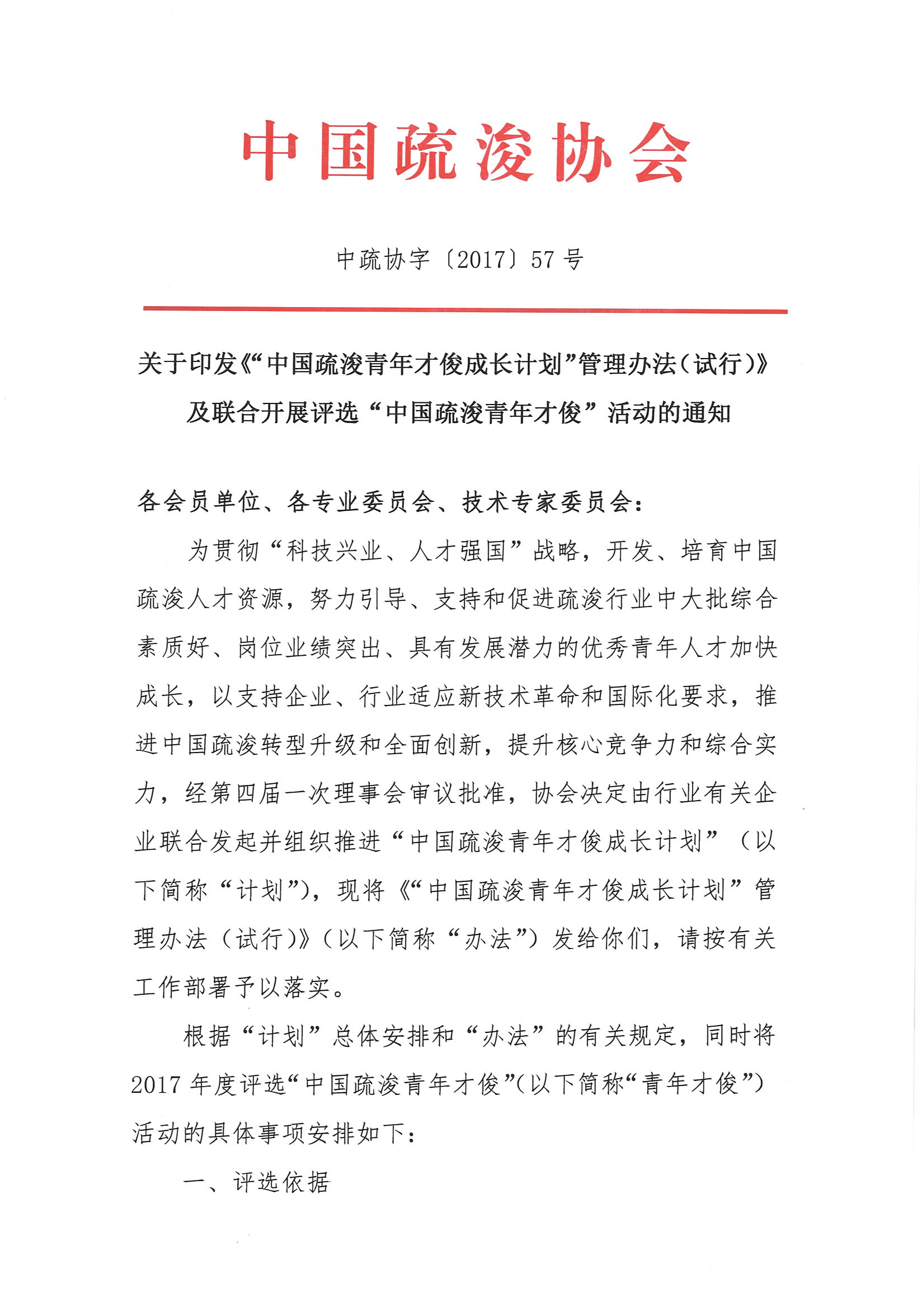 通知下载:关于印发《“中国疏浚青年才俊成长计划”管理办法(试行)》及联合开展评选“中国疏浚青年才俊”活动的通知(中疏协字〔2017〕57号)