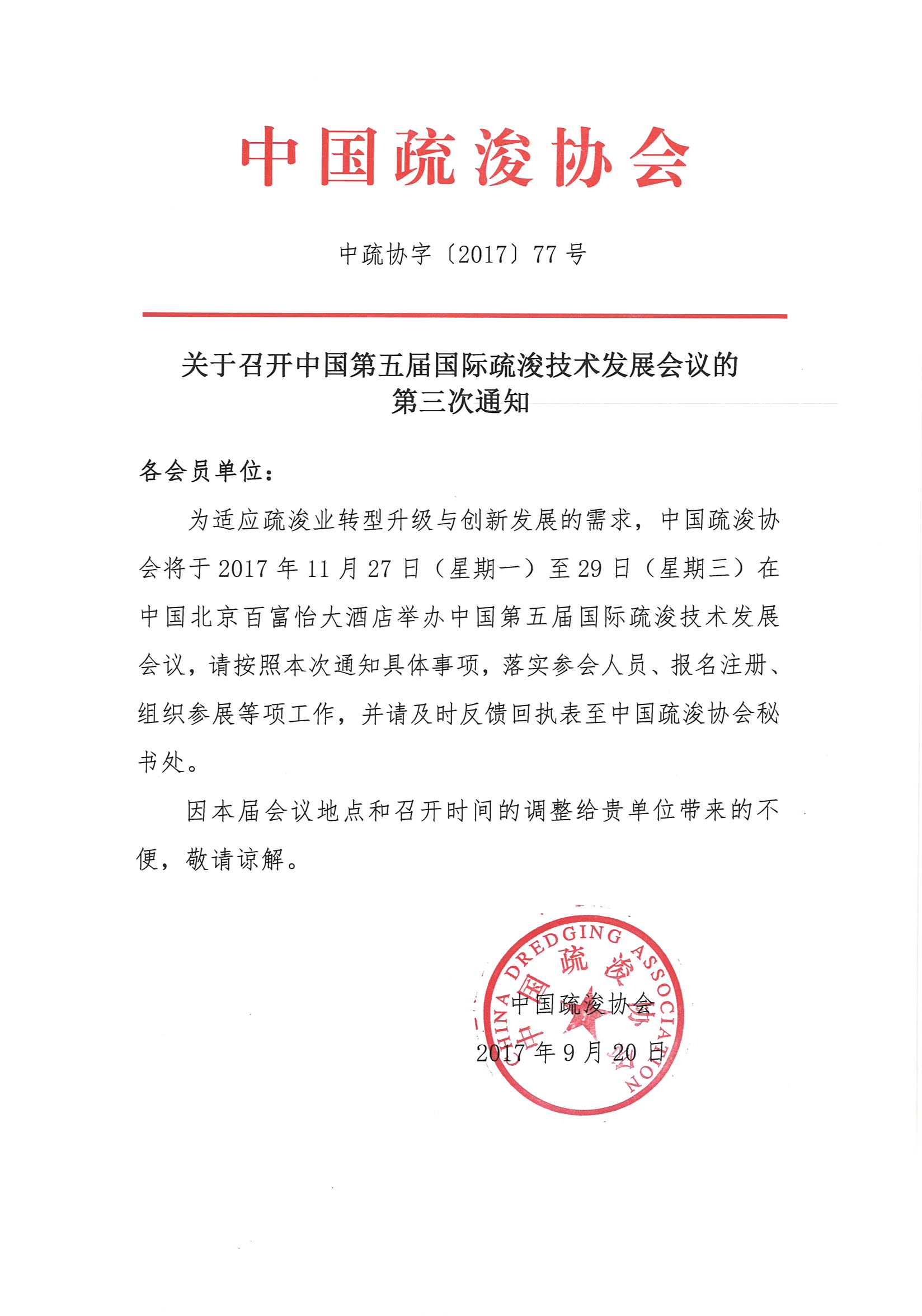 通知下载:关于召开中国第五届国际疏浚技术发展会议的第三次通知(中疏协字〔2017〕77号)