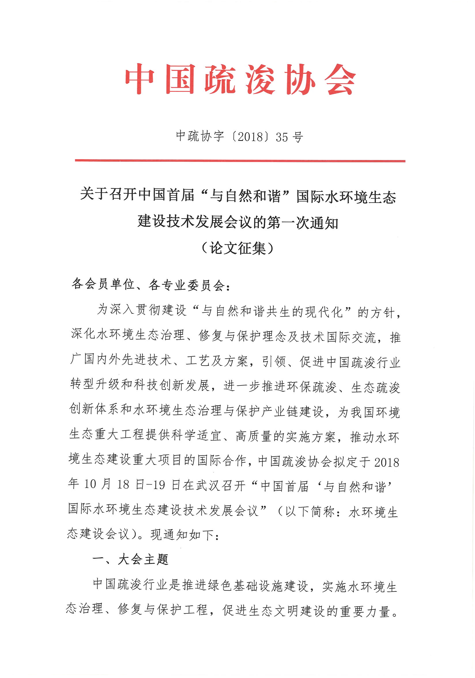 关于召开中国首届“与自然和谐”国际水环境生态建设技术发展会议的第一次通知 (论文征集)