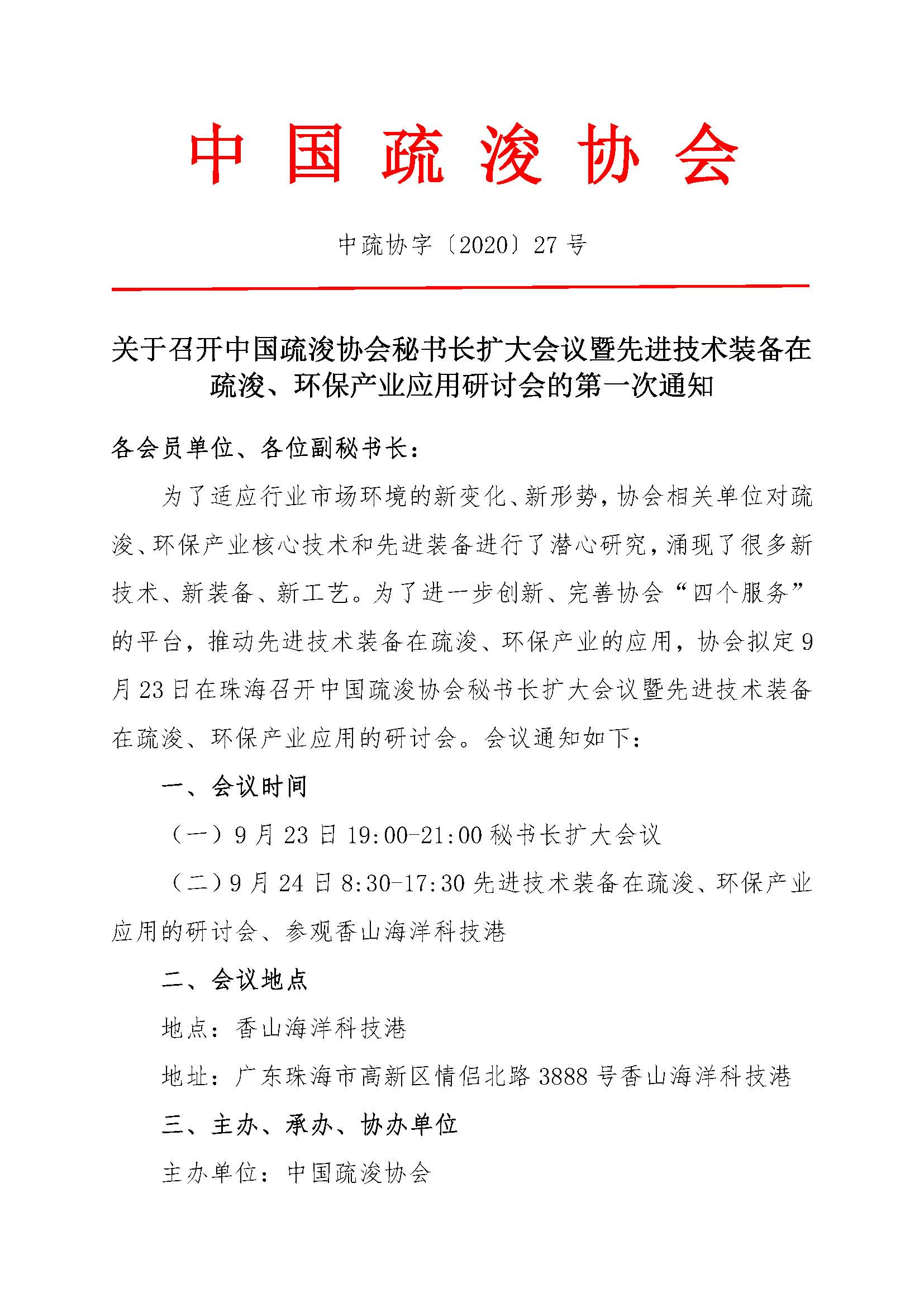 关于召开秘书长扩大会议暨先进技术装备在疏浚、环保产业应用技术研讨会的第一次通知