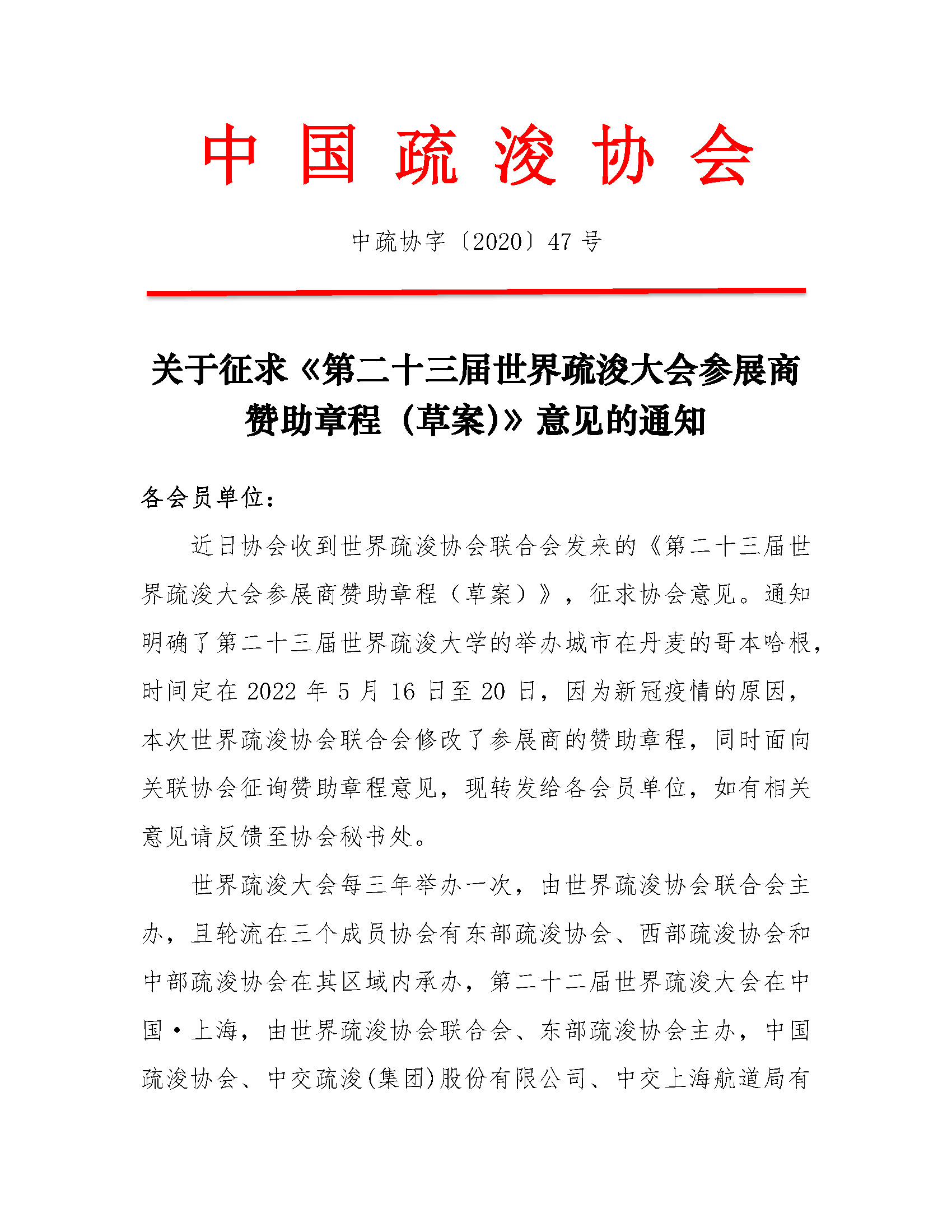 关于征求《第二十三届世界疏浚大会参展商赞助章程(草案)》意见的通知