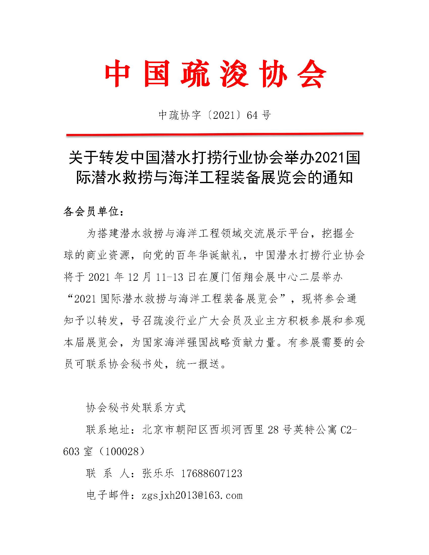 关于转发中国潜水打捞行业协会举办2021国际潜水救捞与海洋工程装备展览会的通知(中疏协字〔2021〕64号)