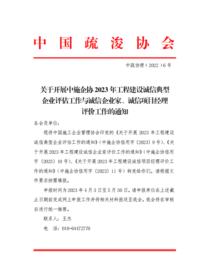 关于开展中施企协2023年工程建设诚信典型企业评估工作与诚信企业家、诚信项目经理评价工作的通知
