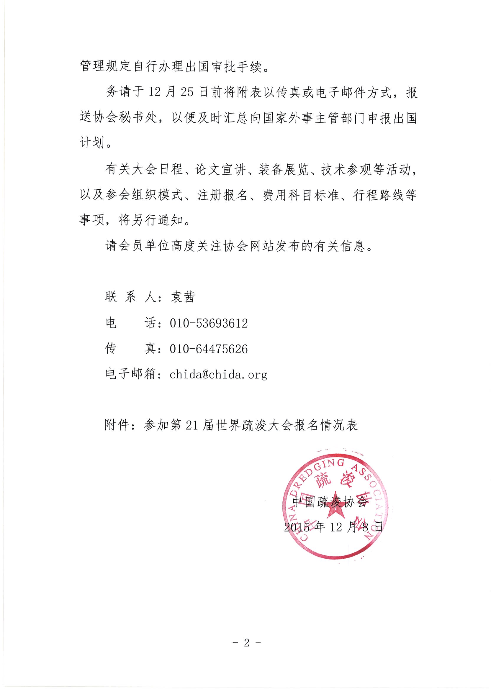 关于参加第21届世界疏浚大会的通知(中疏协字〔2015〕77号)