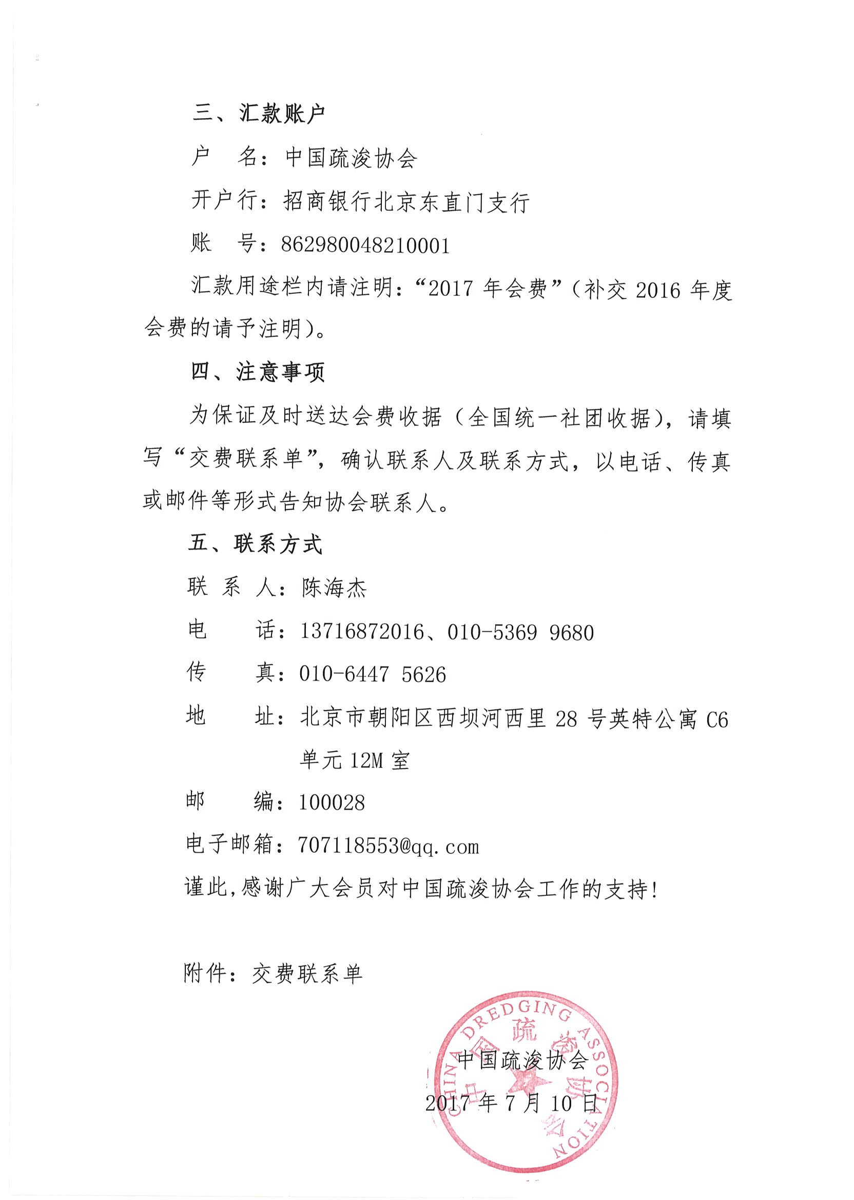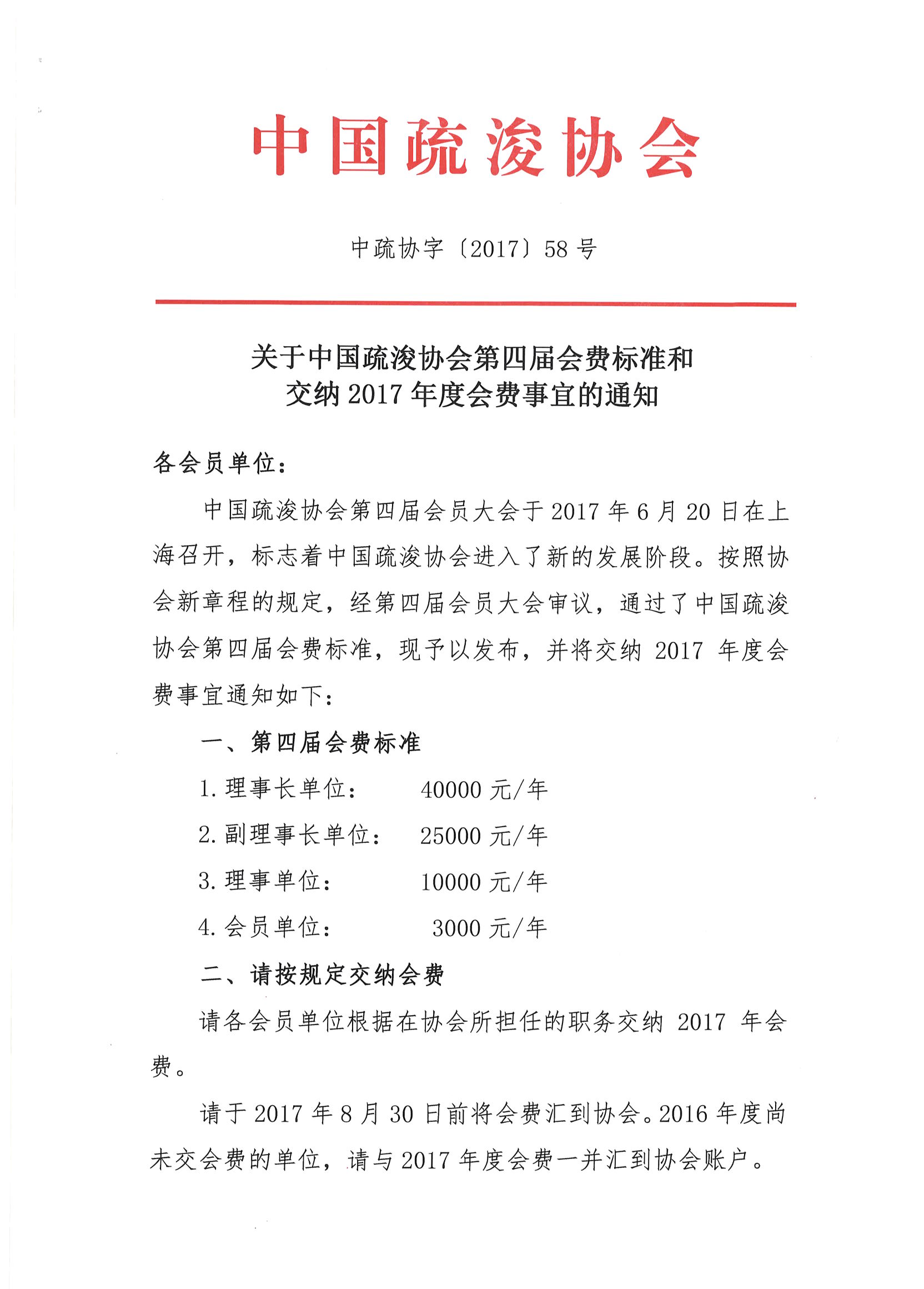 关于中国疏浚协会第四届会费标准和交纳2017年度会费事宜的通知
