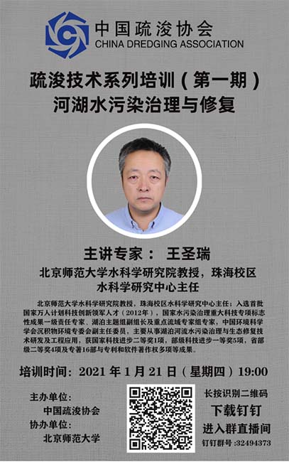 为进一步推动疏浚行业稳定健康可持续发展,普及疏浚基础知识,提升疏浚从业者专业水平,中国疏浚协会举办了疏浚技术系列培训,第一期第十三讲为河湖水污染治理与修复,于1月21日19:00由北京师范大学水科学研究院教授王圣瑞担任主讲专家,敬请大家准时参加。