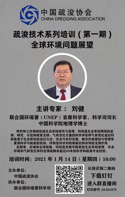 为进一步推动疏浚行业稳定健康可持续发展,普及疏浚基础知识,提升疏浚从业者专业水平,中国疏浚协会举办了疏浚技术系列培训,第一期第十一讲为全球环境问题展望,于1月14日16:00由联合国环境署(UNEP)首席科学家刘健担任主讲专家,敬请大家准时参加。