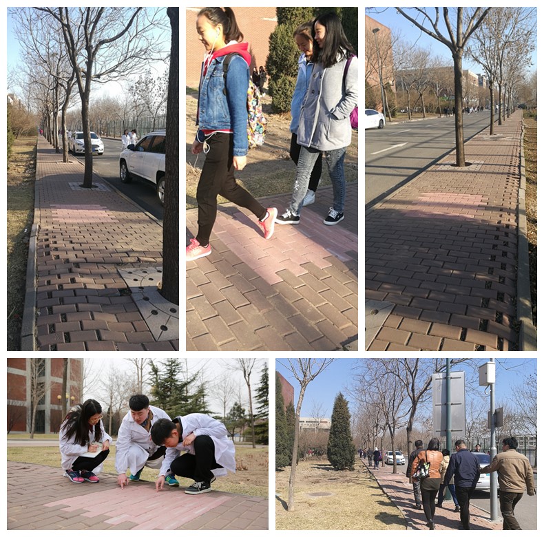 为了检测疏浚底泥免烧砖在阳光暴晒、温差变化、风力侵蚀、雨雪冰冻天气和植物生长等自然条件下以及人行走踩踏过程中的耐久性能;课题组在人流量较大的天津科技大学泰达校园人行道上铺设了2平米免烧砖。